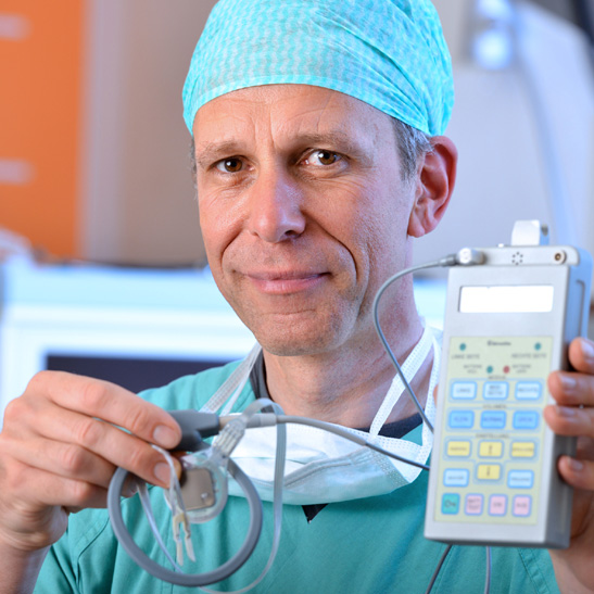 Mit der Unterstützung durch erfahrene Operateure wird dann in der DRK-Kinderklinik Siegen der Zwerchfellschrittmacher operativ implantiert. Anschließend findet bei uns nach einer angemessenen Zeit das Auftrainieren des Zwerchfellmuskels statt. Hierbei werden Eltern und ggf. die jeweiligen Pflegekräfte intensiv eingewiesen und angeleitet, das System zu betreuen. Ziel ist es, dass der Patient tagsüber komplett über den PNS beatmet wird und mit den entsprechenden individuellen Schrittmachereinstellungen sowie einem meist großen Zugewinn an Freiheit und Mobilität nach Hause entlassen werden kann. Bei späteren Diagnostikaufenthalten in unserem Hause erfolgt eine Überprüfung und Optimierung der Einstellungen des gesamten Systems.
